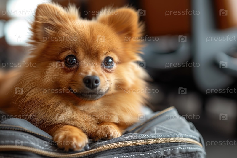 Померанский шпиц сидит на дорожной сумке, готовый к путешествию