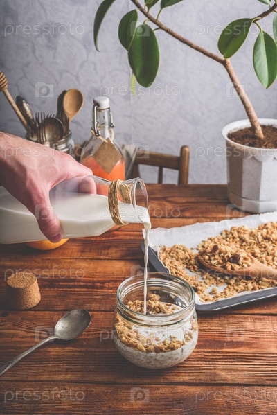 Мужчина наливает молоко на хлопья