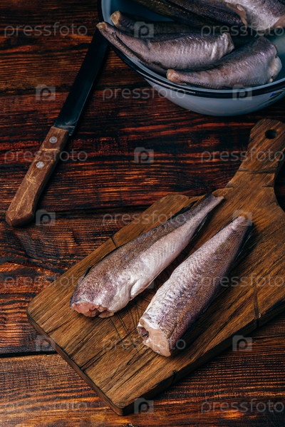 Тушки хека на разделочной доске