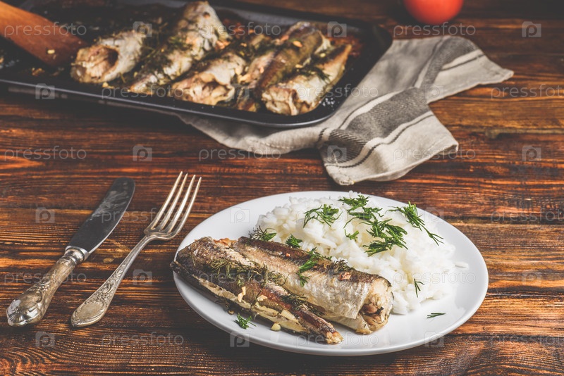Запеченные тушки хека с рисом