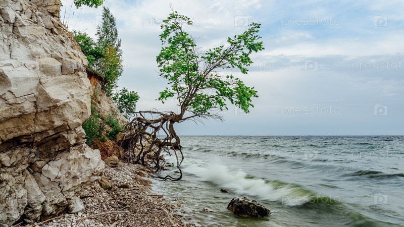 Дерево на скалистом берегу в летний день