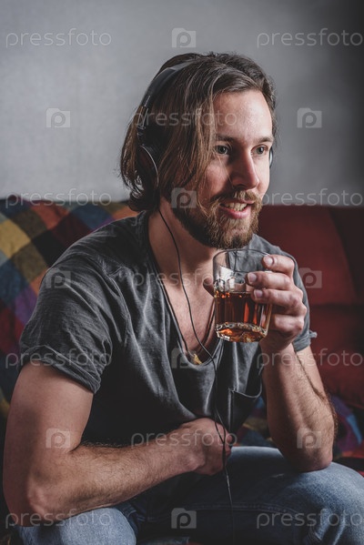 Бородатый мужчина слушает музыку в наушниках