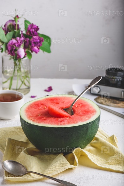 Ложка в половинке спелого арбуза на желтой салфетке