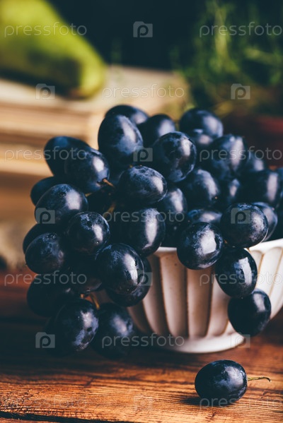 Крупный план темно-синего винограда в винтажной миске на деревянном столе