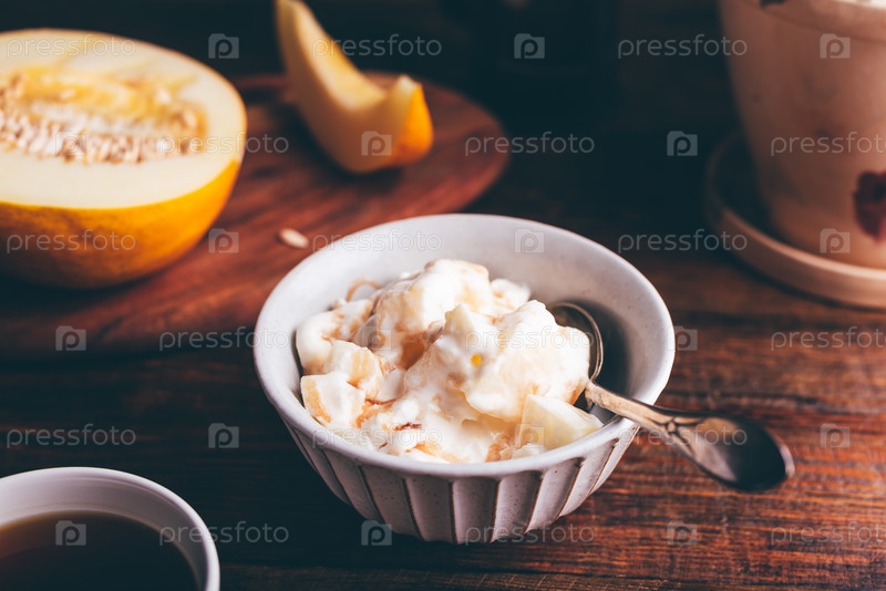 Миска мороженого, смешанного с дыней и политого ягодным сиропом