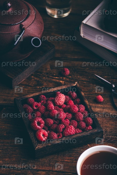 Чашка чая с малиной и книга на столе