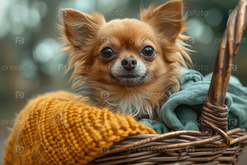 Собака чихуахуа в корзине, готовая к путешествию