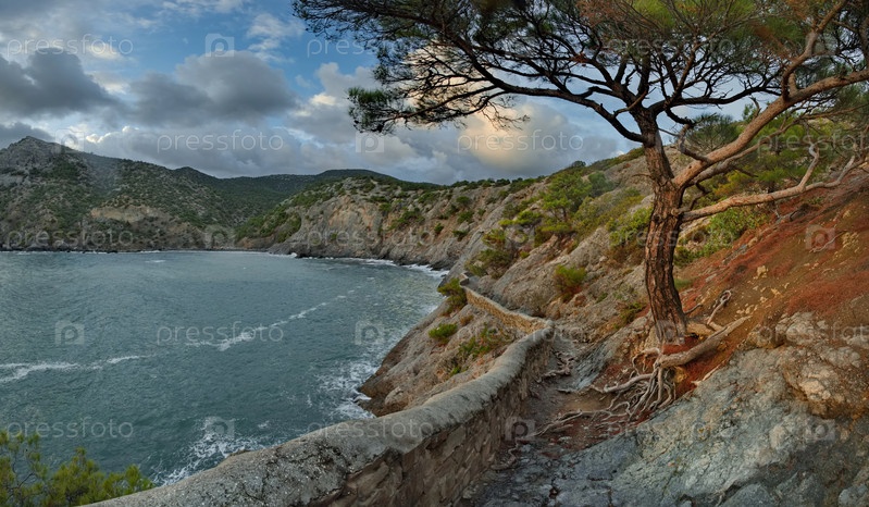 Россия, Новый Свет. Вид на облагороженные туристические тропы в крутых скалах на Крымском мысе Капчик Юго-Восточного побережья Черного моря