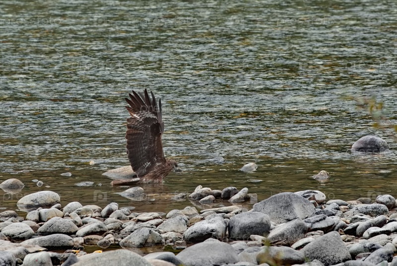 Россия. Республика Бурятия. Молодой коршун охотится на каменистом берегу горной реки Тисса