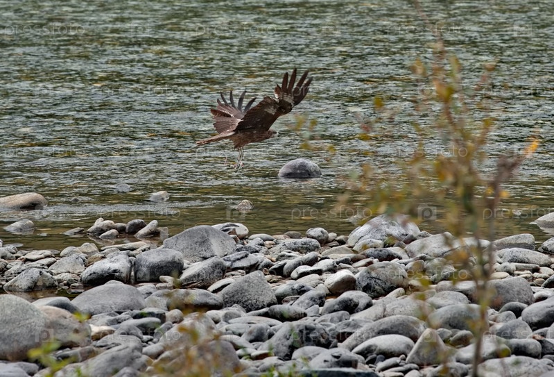 Россия. Республика Бурятия. Молодой коршун охотится на каменистом берегу горной реки Тисса