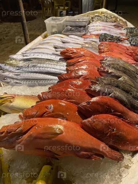 Свежая рыба на прилавке на базаре