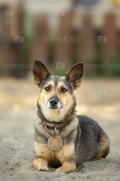Дворняга рыжего окраса лежит на животе на траве, вытянув передние лапы вперед. Весна