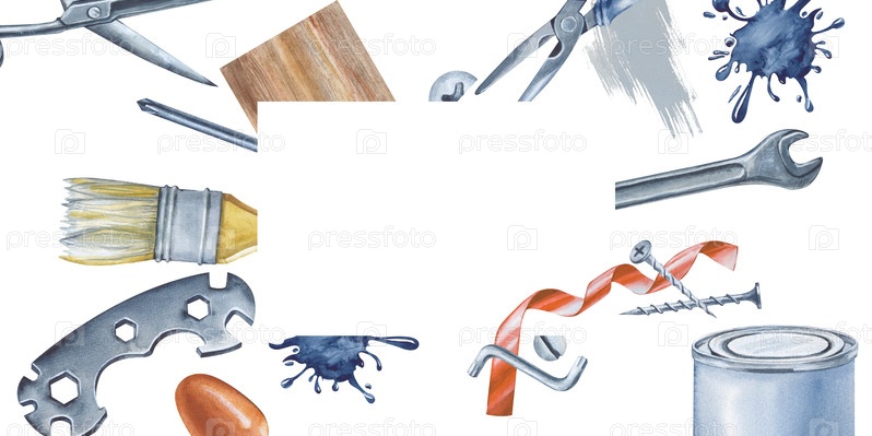 Горизонтальная рамка с нарисованными от руки рабочими инструментами. Место для вашей надписи. Акварельные ножницы, кисть, деревянная доска, пятно краски, отвертка, гаечный ключ, клякса, изолента, банка краски, гвозди и шурупы