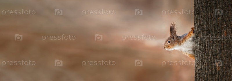 Милая молодая белка на дереве с протянутой лапой на фоне размытого зимнего леса