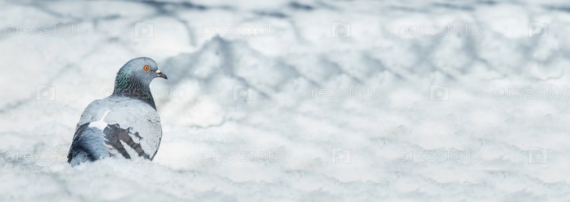Красивый голубь сидит на снегу в городском парке зимой