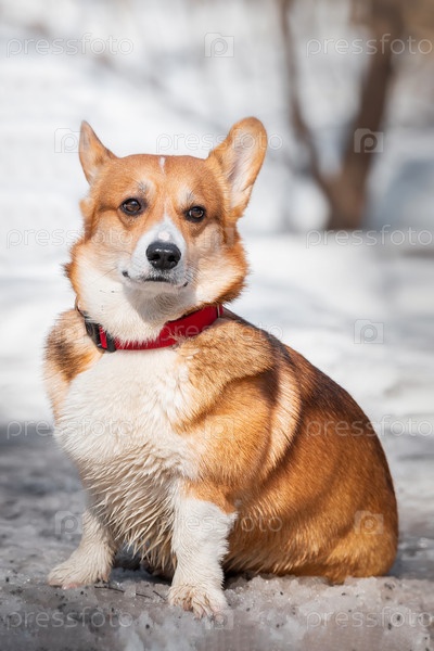 Вельш-корги пемброк в зимнем лесу