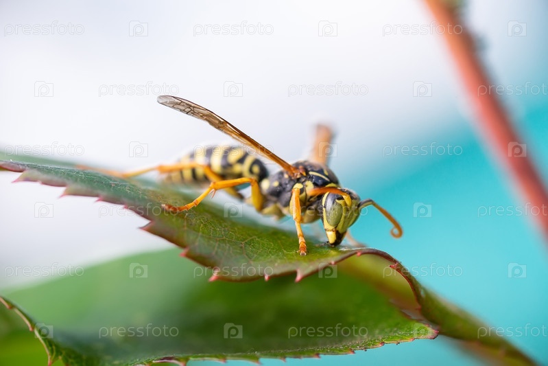 Оса сидит на зеленых листьях. Опасная желто-черная полосатая оса сидит на листьях