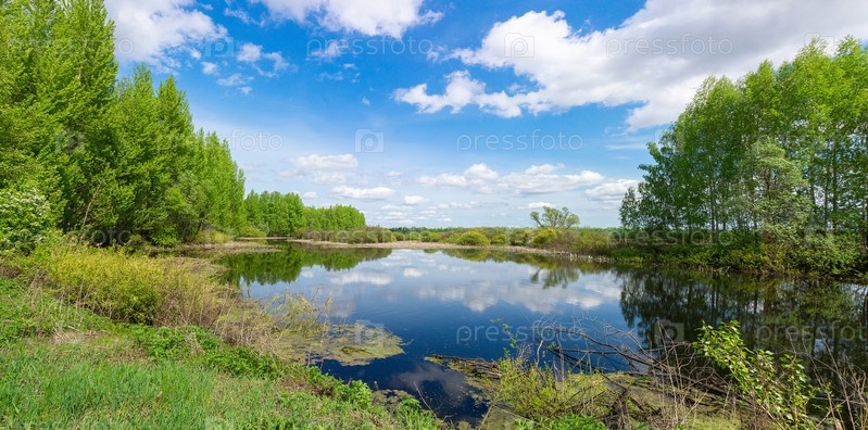 Яркий летний панорамный пейзаж с красивым прудом и зелеными деревьями в солнечный день