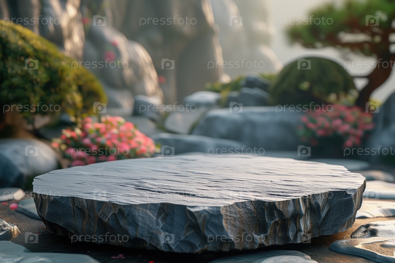 Пустой каменный подиум на фоне восточного сада