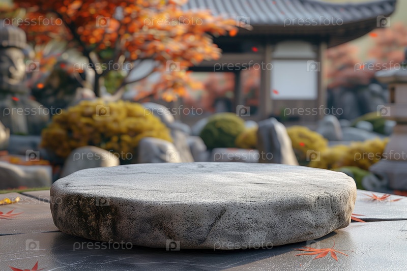 Пустой каменный подиум на фоне восточного сада