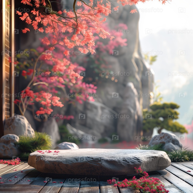 Пустой каменный подиум на фоне восточного сада