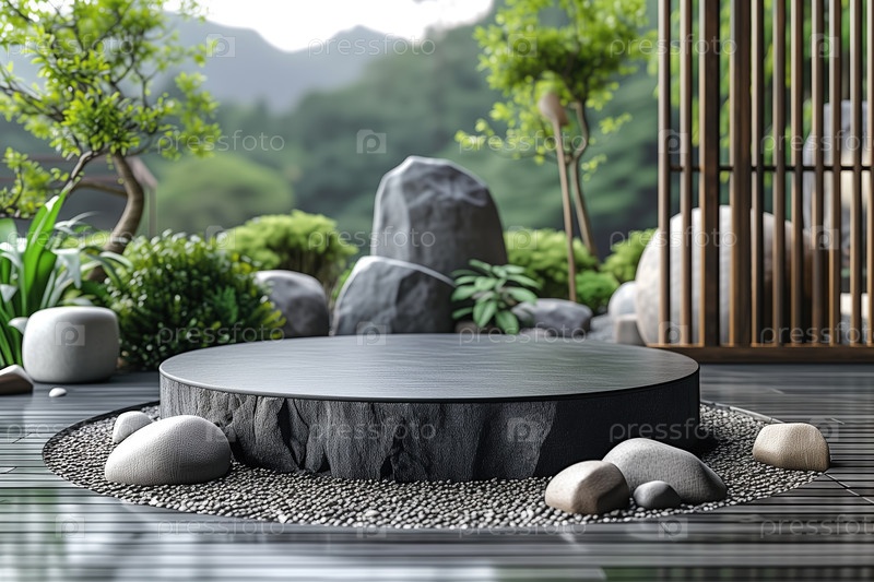 Пустой каменный подиум на фоне восточного сада