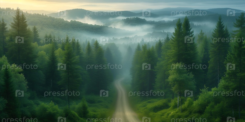 Вид с воздуха на туманный горный хвойный лес с грунтовой дорогой