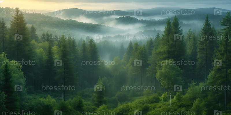 Вид с воздуха на туманный хвойный лес