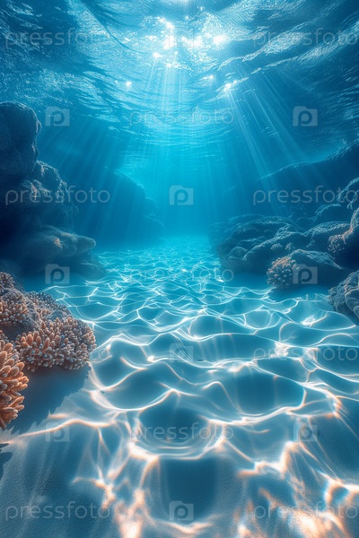 Подводный вид с песчаным дном, солнечными лучами и лучами света