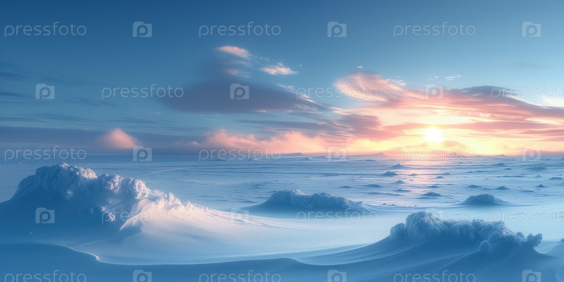 Холодный рассвет над заснеженным арктическим ландшафтом с торосами