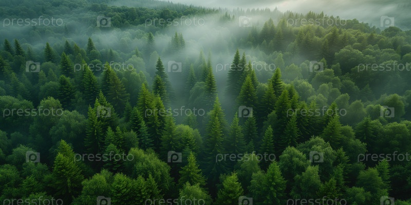 Вид с воздуха на туманный хвойный лес