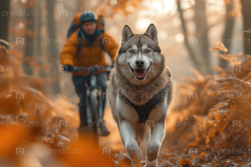 Собака породы хаски бежит с велосипедистом на прогулке
