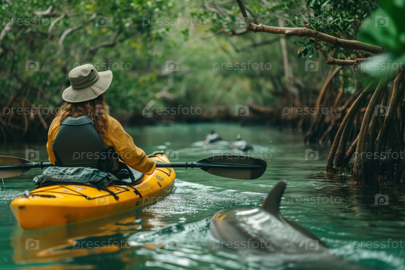 Экотуризм, каякинг вдоль мангрового побережья с наблюдением за дельфинами