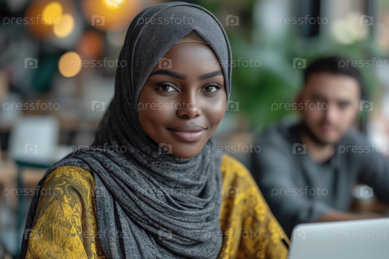 Молодая женщина в хиджабе работает за компьютером в футуристическом офисе