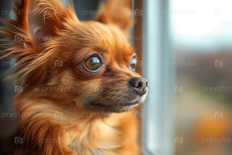 Собака чихуахуа едет в поезде, смотрит в окно