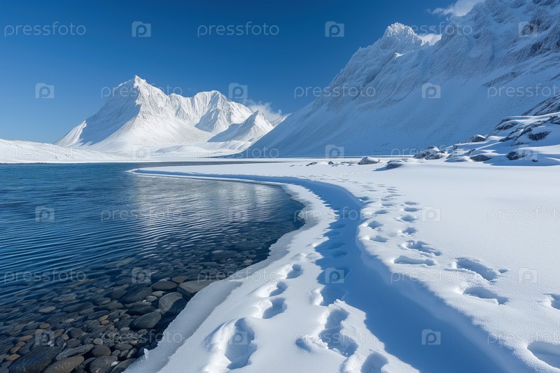 Заснеженное побережье, арктический пейзаж с горами и озером