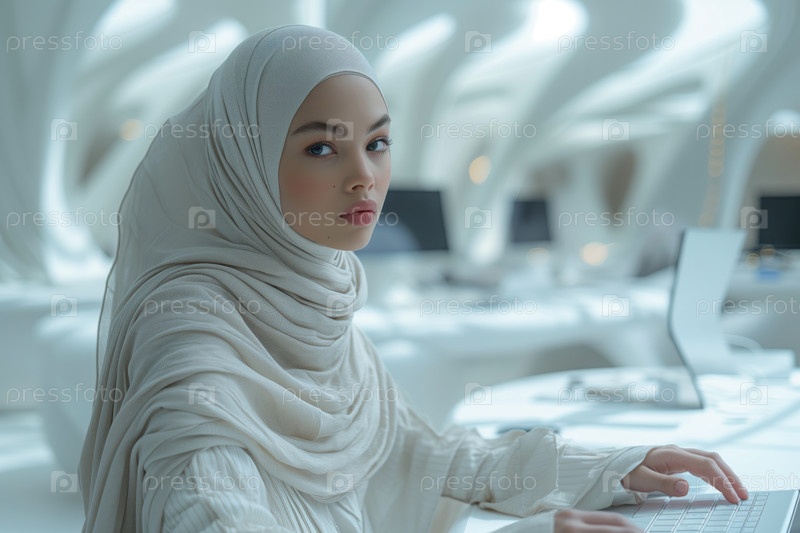 Молодая женщина в хиджабе работает за компьютером в футуристическом офисе