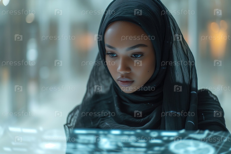 Молодая женщина в хиджабе работает с футуристическим прозрачным интерфейсом