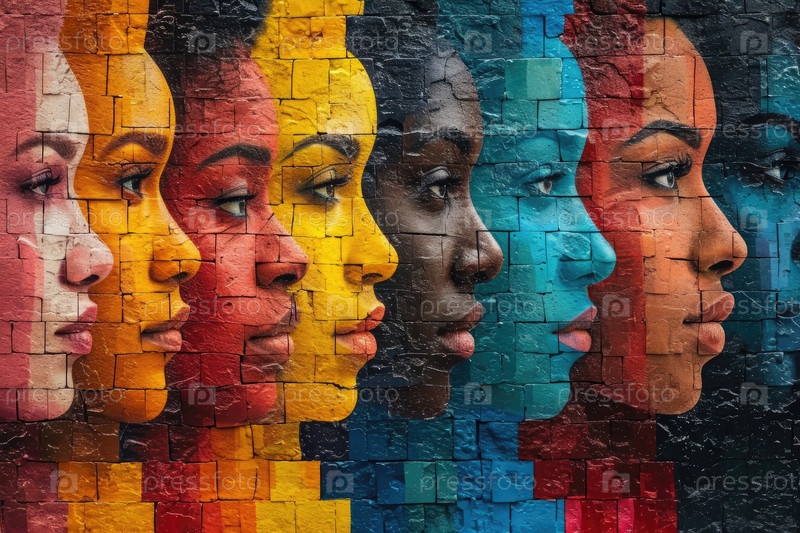 Фон, фреска с разноцветными лицами, символизирующими единство и многообразие