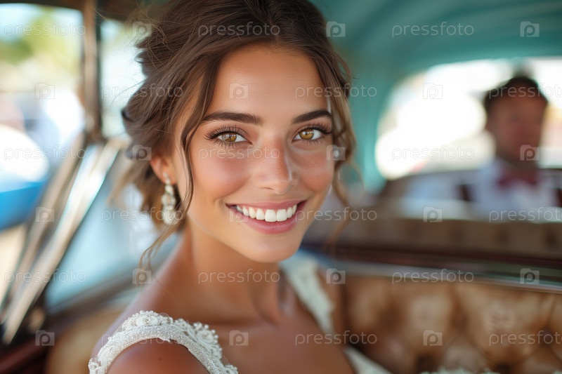 Счастливая девушка в платье невесты в лимузине