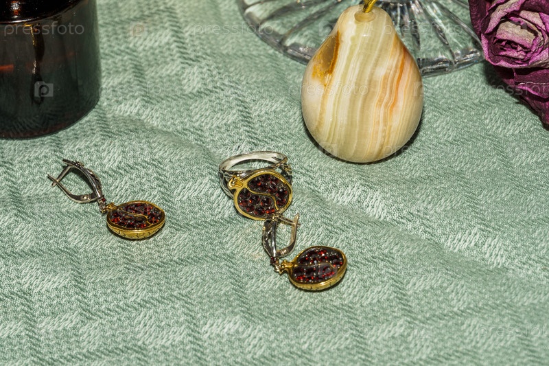 Натюрморт. Украшения из граната на столе