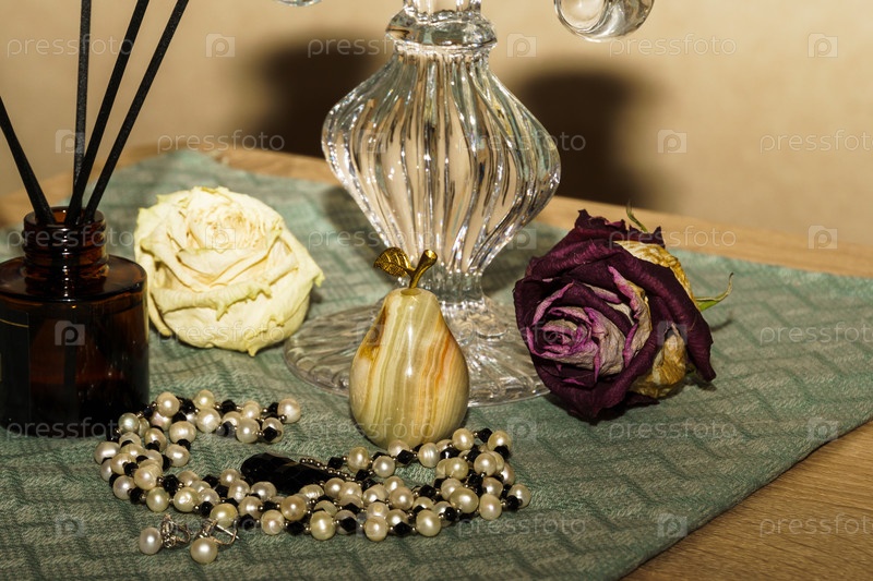 Натюрморт. Подсвечник, аромадиффузор, груша из оникса, бусы из жемчуга и засохшие бутоны роз на столе