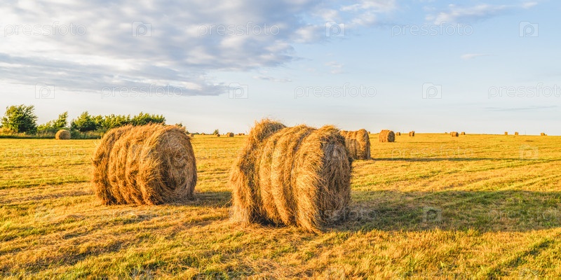 Рулоны сена на скошенном поле в солнечный день