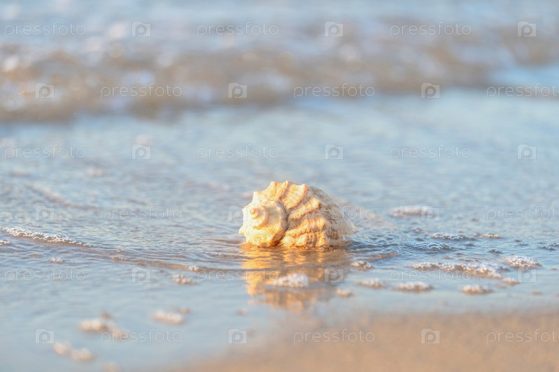 Красивая ракушка лежит на пляже, рядом с лазурной водой моря