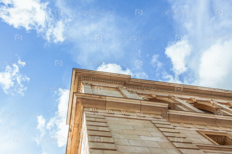 Часть старого архитектурного комплекса, голубое небо, белые облака, фон, вид снизу, тонированный