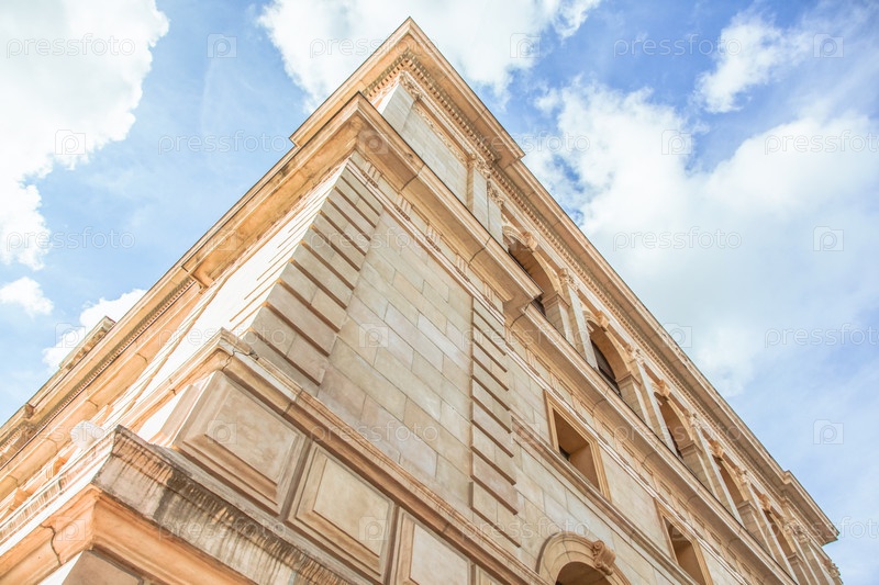 Часть старого архитектурного комплекса, голубое небо, белые облака, фон, вид снизу, тонированный
