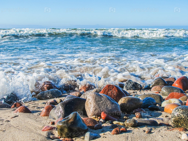 Камни лежат на песчаном пляже у моря под летним солнцем