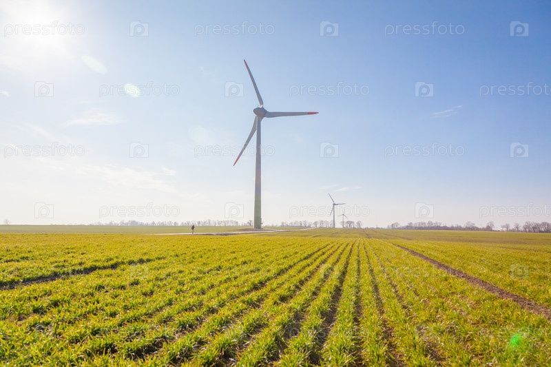 Ветряная турбина на зеленом поле с солнечными бликами на фоне голубого неба