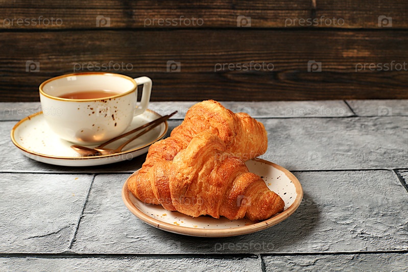 Вкусные круассаны и чашка капучино на деревянном столе. Здоровый завтрак с ингредиентами, концепция идеального утра и традиционной национальной кухни, реклама пекарни