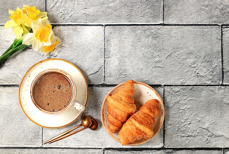 Вкусные круассаны, чашка капучино и букет нарциссов на бетонном столе. Здоровый завтрак с ингредиентами, концепция идеального утра и традиционной национальной кухни, реклама пекарни,